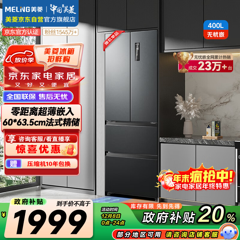 美菱(MeiLing)400升法式四開(kāi)多門冰箱小戶型家用底部散熱超薄窄門嵌入式一級(jí)無(wú)霜大容量灰BCD-400WP9CZX國(guó)家補(bǔ)貼